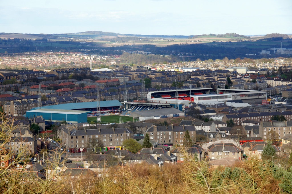 “Dens Park and Tannadice Park from Dundee Law (geograph 3933382)” by Mike Pennington is licensed under CC BY-SA 2.0.